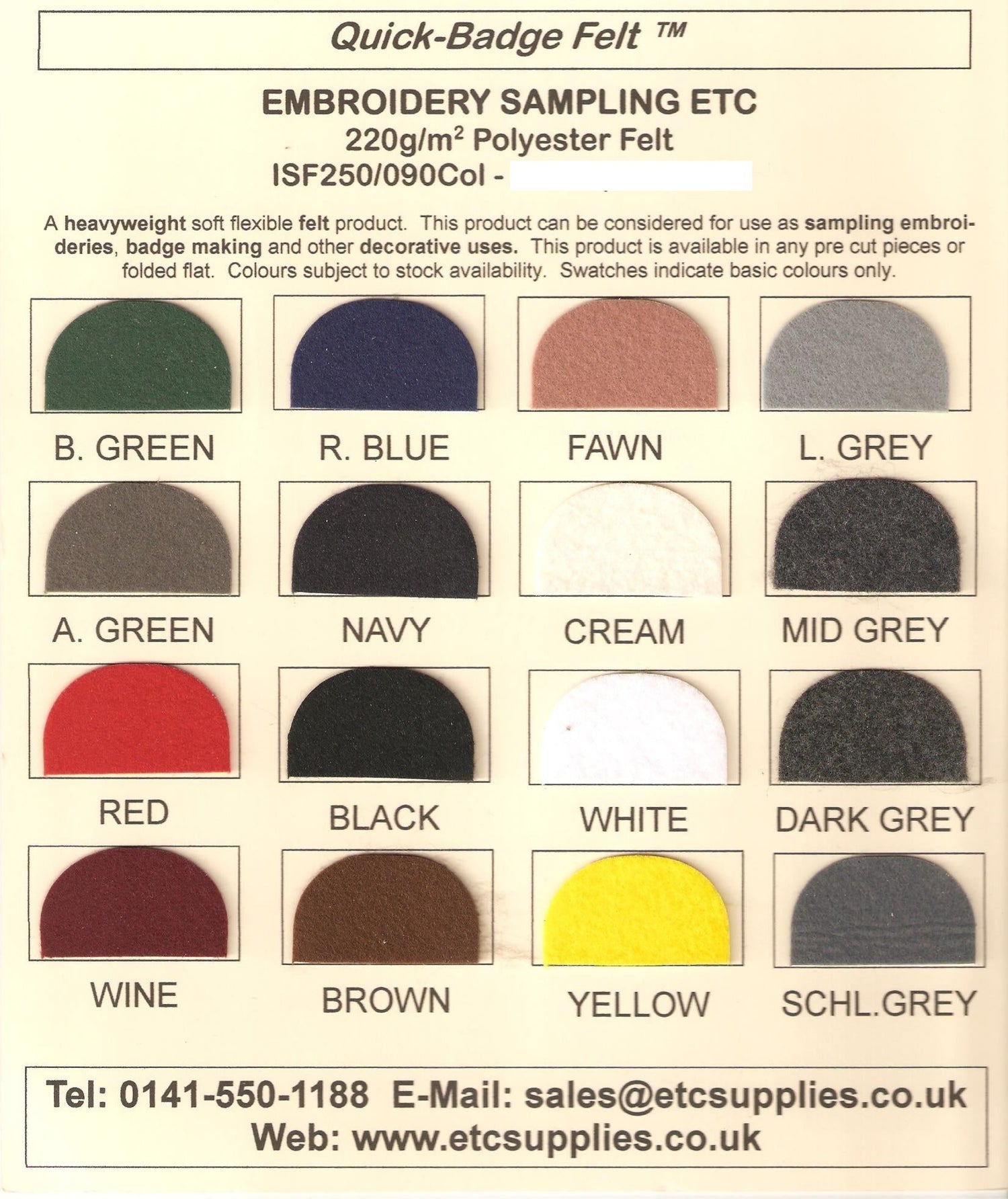 A good quality dense Polyester felt for making embroidery samples and badges etc.